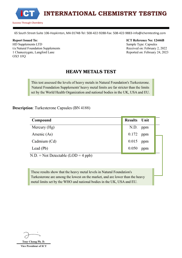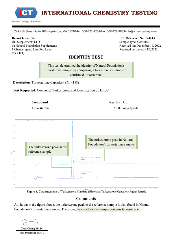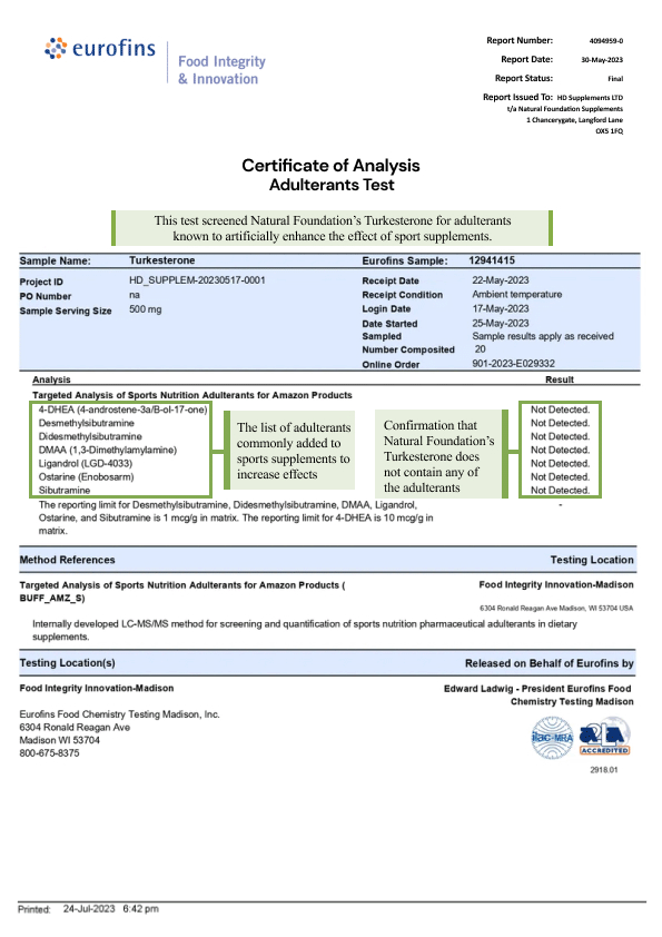 Our turkesterone has been 3rd-party tested to show it is authentic, low in heavy metals, and free of the following illegal adulterants: 4-DHEA (an anabolic steroid), SARMs (ostarine and ligandrol), and sibutramine and DMAA (stimulants).